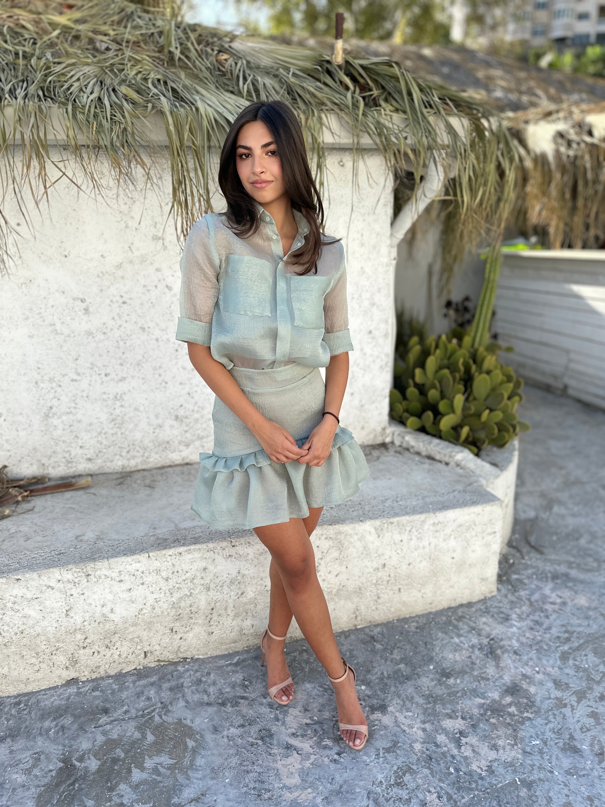 Mist Green Organza shirt &Ruffled Skirt Set, A soft and sophisticated set crafted in dreamy mist _green shade.the sheer organza shirt features delicate pockets and refined buttons, blending structure with lightness for an effortlessly chic look.this airy fabric and gentle color make this set perfect for sunny days ,stylish outings, and lovely lunches or dinners.