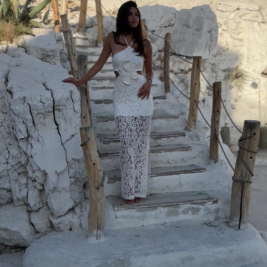 Long Lace Dress with Floral detail,A dreamy dress designed for tropical escapes and sun_kissed getaways .this peice brings a soft ,feminine elegance to your holiday wardrobe.a dress that captures the feeling of freedom ,beauty ,and vacation chic.